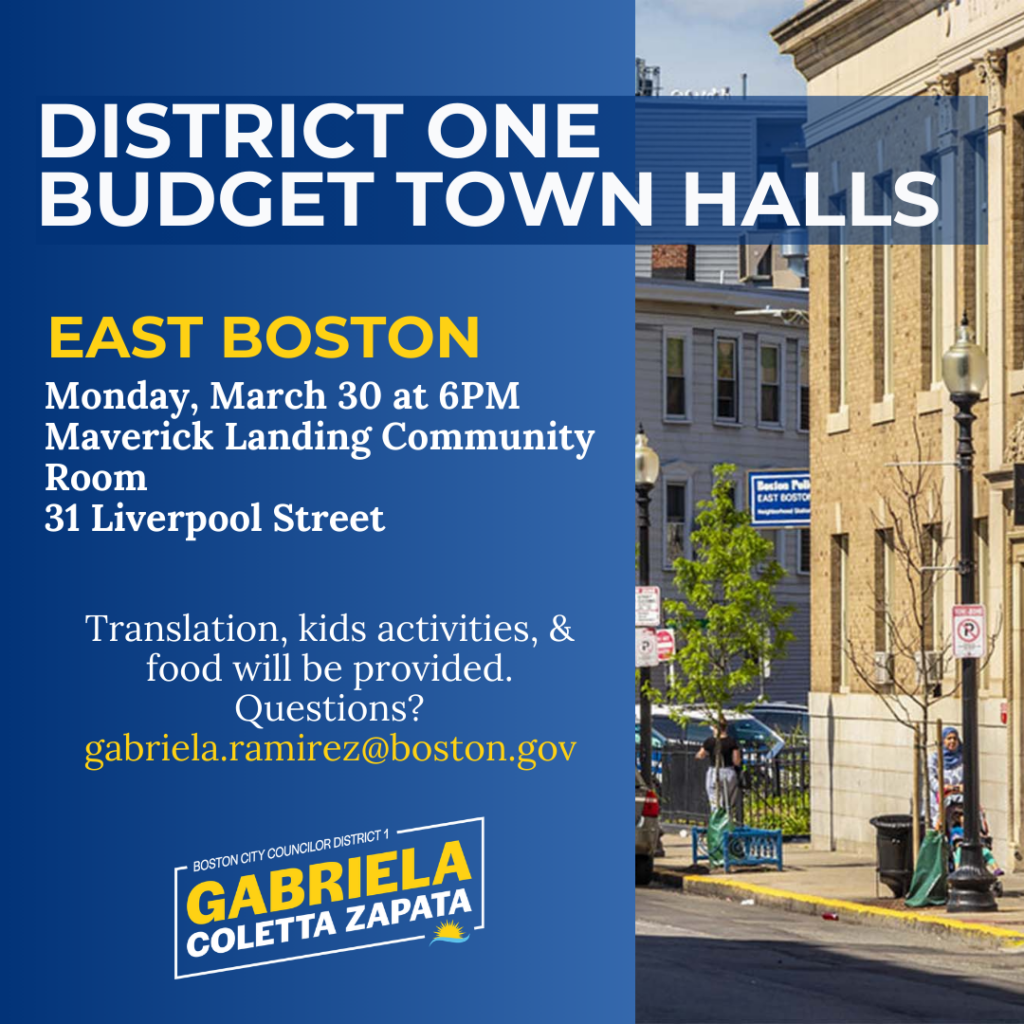 BOSTON – Boston City Councilor Gabriela Coletta Zapata is hosting a series of Budget Town Halls across District One to engage directly with residents and gather input on budget priorities ahead of the City Council’s annual budget review for fiscal year 2027.