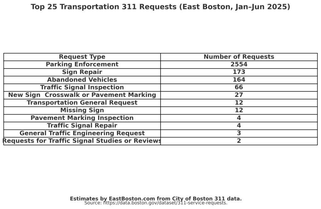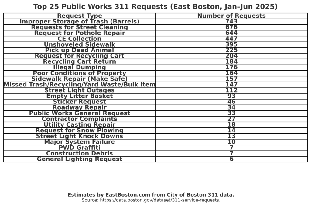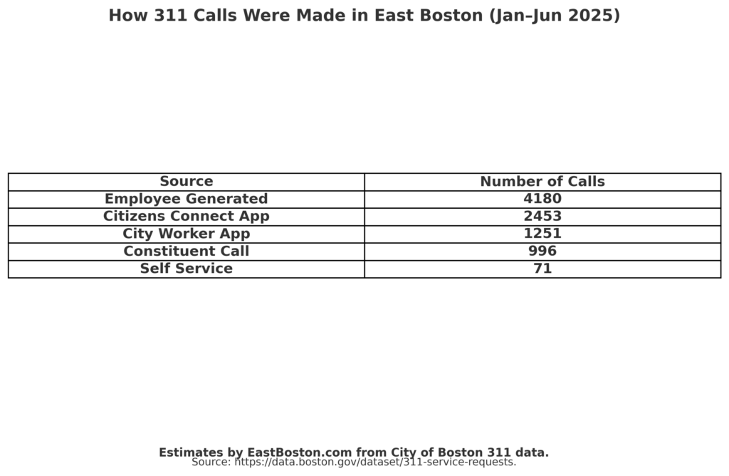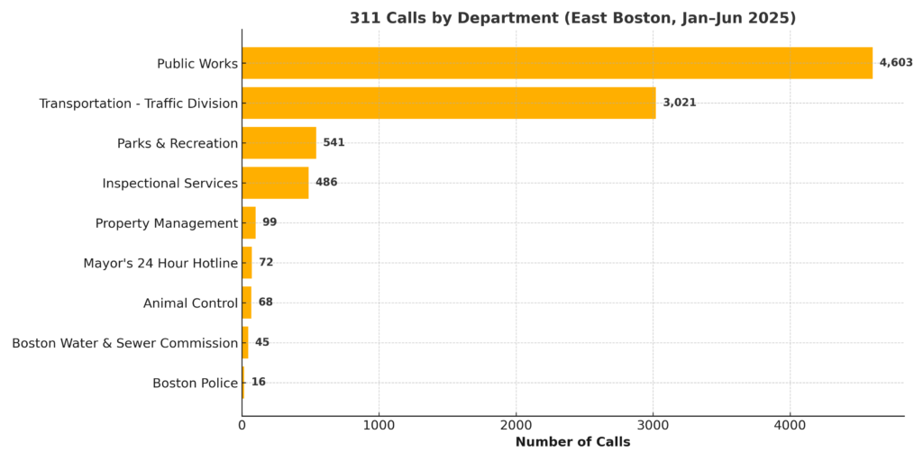 311 CallsCity DepartmentsCity ServicesNews-2025Original Content EastBoston.com exclusive: Calls to City Hall from January 2025 through June 2025 By admin - September 22, 2025 894 Here are a few quick snapshots of data from the City of Boston’s 311 calls compiled by EastBoston.com