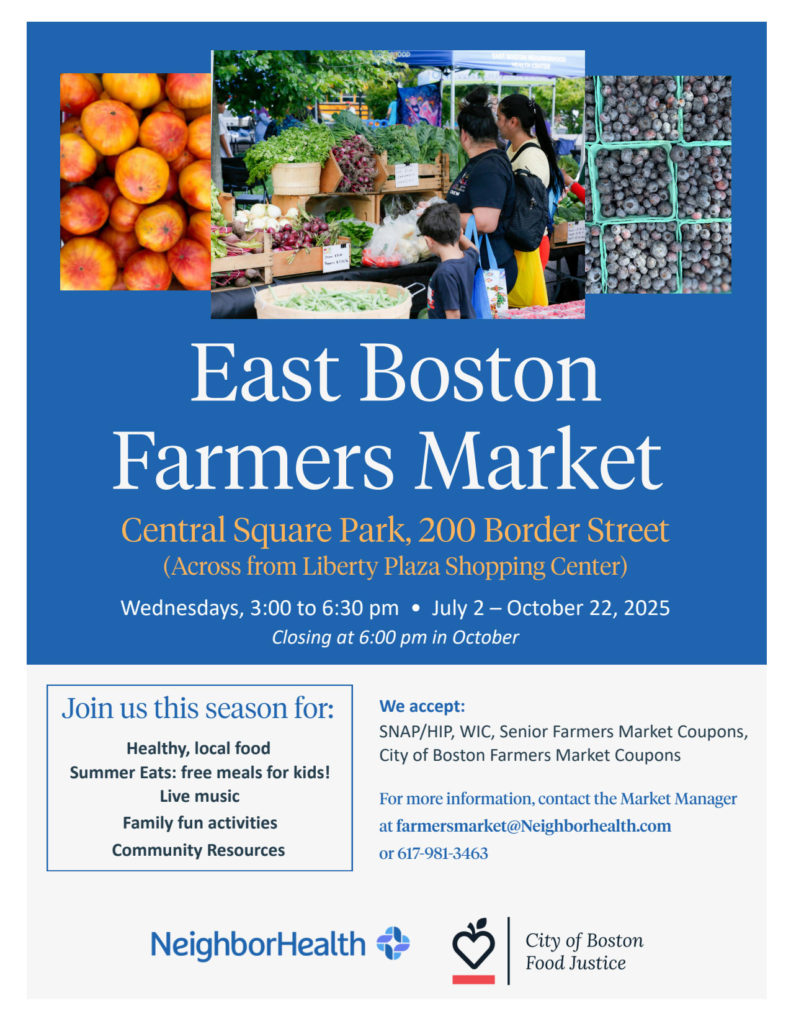 Farmers Market Opens By admin - June 24, 2025 127 Date: July 2, 2025 Time: 3:00 pm - 6:30 pm Calendar: East Boston More information here on EastBoston.com