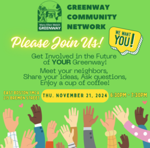 From the Greenway Council: Join us for our upcoming Greenway Community Network meeting, November 21, 2024 6:30PM-7:30PM at the East Boston YMCA! This meeting will replace our past “Council Meetings”. The new Greenway Community Network will provide an informal, social and collaborative forum for community members to engage in the Greenway’s mission and get involved. Participation can range from sharing ideas and insights, volunteering or just listening and learning about what is going on. There is no commitment. All are welcome and encouraged to join. Coffee and treats will be provided! This is YOUR Greenway – come be a part of it!