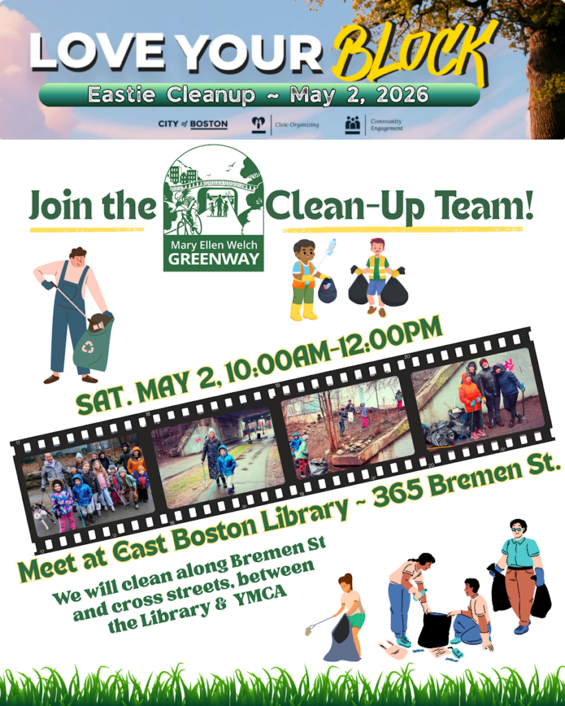 Greenway Love Your Block By admin - April 28, 2026 14 Date: May 2, 2026 Add to Calendar Google CalendarMicrosoft OutlookApple CalendarDownload Time: 10:00 am - 12:00 pm Calendar: East Boston Cleaning up the Greenway from the East Boston Branch of the Boston Public Library to the YMCA