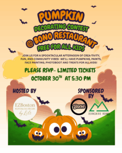 Free pumpkin decorating event scheduled Thursday, 10/30/25 at 5:30 p.m. hosted by EZ Boston Rentals and Decor by Lili and sponsored by Bono and Berkshire Roots at 173 Meridian Street here in East Boston. RSVP required.