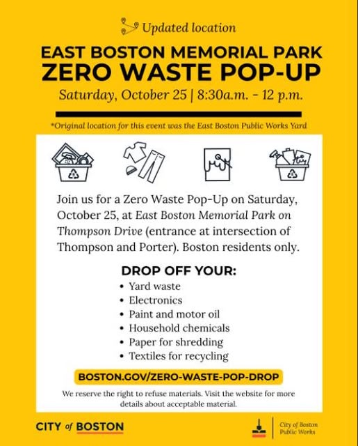 There is a Zero Waste Pop-up at the East Boston Memorial Park on Saturday, October 25, 8:30am-12pm. Bring your yard waste, electronics, paint & motor oil, household chemicals, paper for shredding, and textiles for recycling. For more information go to boston.gov/zero-waste-pop-drop or see the flier below.