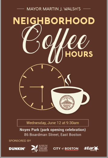 June 12: Mayor Walsh’s Coffee Hour in East Boston and the Re-opening of Noyes Park, June 12, 2019