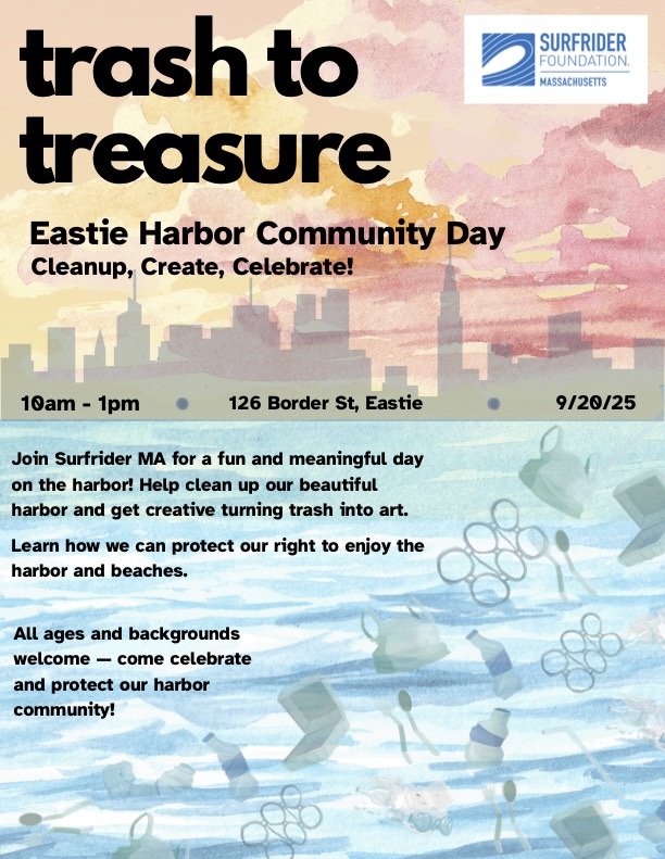 What: “Trash to Treasure / De basura a tesoro” East Boston harbor cleanup and trash-to-art project. This free, family-friendly event will bring neighbors together for a morning of fun by the water, featuring a shoreline cleanup and a collaborative art project led by art activist Rebecca McGee Tuck using materials collected from the cleanup. The event will celebrate East Boston’s waterfront while creating space for connection, creativity, and coastal care. Informational signage will also be displayed to raise awareness about public shoreline access rights.