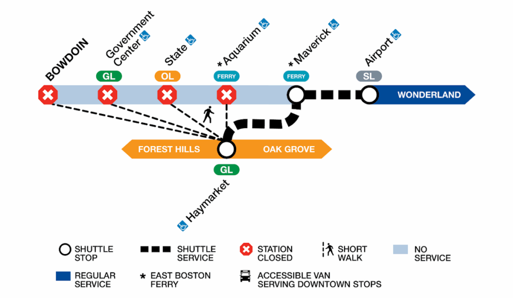 - Free and accessible shuttle buses will make stops at Airport, Maverick, and Haymarket on the Green and Orange lines.