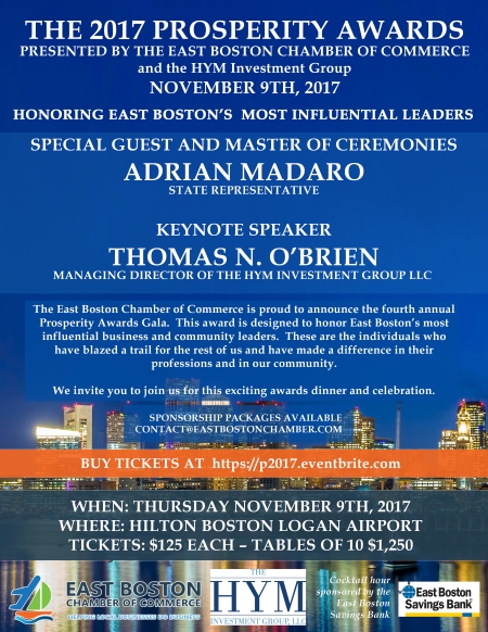 The Board of Directors of the East Boston Chamber of Commerce is pleased to announce the recipients of the 2017 Prosperity Awards. The recipients will be formally honored and recognized at the Prosperity Awards Gala taking place at 6pm on Thursday, November 9, 2017 at the Hilton Logan Airport. Our Presenting Sponsor is HYM Investment Group, and the Complimentary Cocktail Reception is Sponsored by the East Boston Savings Bank. The individuals receiving this year’s award are among those who have made significant contributions to the economic and cultural prosperity of East Boston.