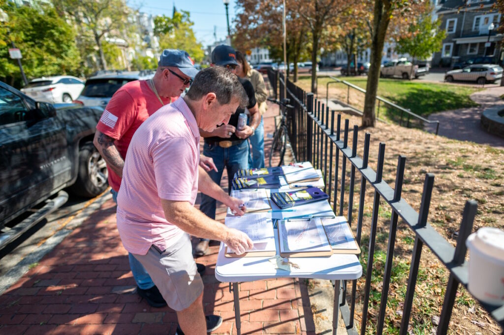 Campaign volunteers prepare literature at Prescott Park for a drop on Eagle Hill, Saturday, October 4, 2025. (Courtesy Photograph)