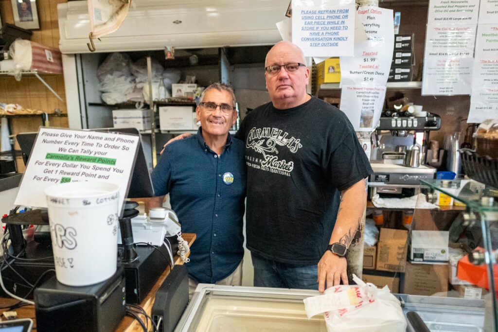 At-large city council candidate Frank Baker with Carmela’s owner Nick Moulaison at the popular East Boston grocery. (Courtesy Photograph)